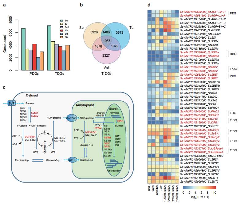 接下來作者研究了黑麥淀粉生物合成相關基因(SBRGs)中的基因復制。研究發現這些重復類型在黑麥淀粉生物合成相關基因(SBRGs)中普遍存在,并且不同的SBRG的復制基因之間往往表現出表達差異,說明不同類型的基因復制可以豐富黑麥基因在重要生物過程中的遺傳多樣性(圖4c),這些黑麥SBRGs的新變化可能為調控植物淀粉生物合成和性質提供新的酶活性,因此解析全套黑麥SBRGs有利于提高黑麥的產量潛力和營養品質。