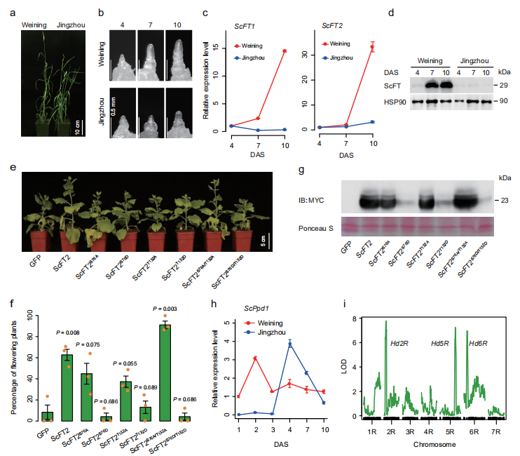 在長日照條件下,威寧黑麥比荊州黑麥提前抽穗10-12天(圖6a),這與威寧黑麥莖尖分生組織發育更快有關(圖6b)。在威寧黑麥基因組中,注釋到在長日照條件下高表達的兩個開花位點(FT)基因ScFT1(ScWN4R01G446100)和ScFT2(ScWN3R01G192500)。播種后7天和10天,ScFT1和ScFT2在威寧黑麥中的表達水平顯著高于荊州黑麥(圖6c),且ScFT蛋白在黑麥中積累到相對較高水平,而荊州黑麥中幾乎沒有(圖6d)。檢測到的ScFT蛋白的大小(~29 kDa)比預測出的ScFT1和ScFT2的分子量大(~19 kDa)(圖6d),表明ScFT蛋白具有潛在的翻譯后修飾。用高效檢測磷蛋白的磷酸標記SDS-PAGE分析表明,威寧黑麥中ScFT確實發生了翻譯后磷酸化修飾。