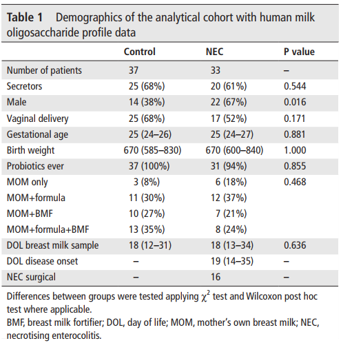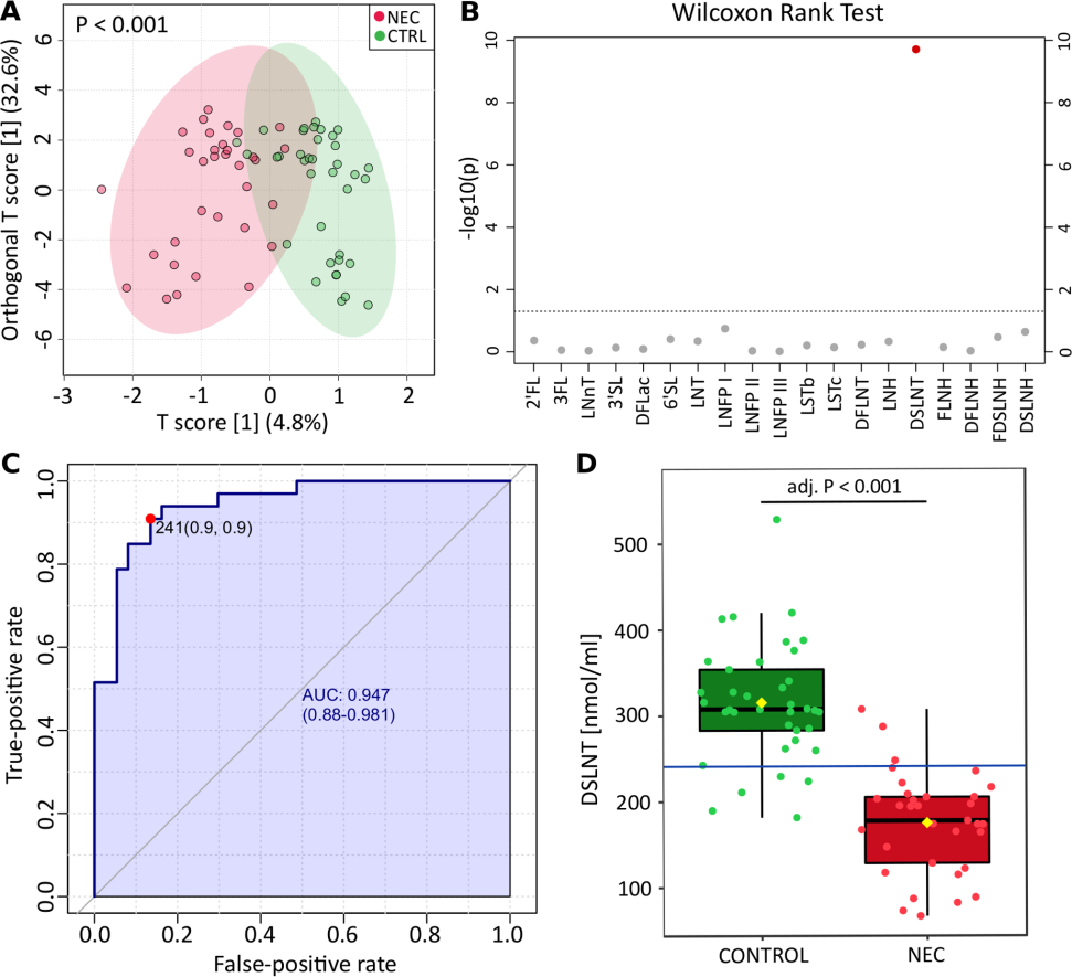 考慮到較低的DSLNT與NEC相關而不受分泌狀態的影響,作者探討了HMO作為NEC發育的生物標志物的用途。單因素ROC曲線分析表明,241nmol/ml是MOM中DSLNT鑒別NEC和對照嬰兒的最佳濃度(圖1C和D)。AUC值為0.947,靈敏度為0.9,特異性為0.9。
