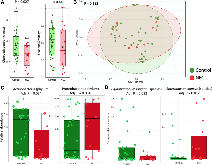 作者納入了含有HMO數據的嬰兒的糞便微生物組數據,進行獨立研究獲得宏基因組測序數據。14例NEC患兒和34例對照組的644個糞便樣本。NEC患兒物種豐富度顯著降低,shannon指數差異不顯著(圖3A)。PCoA分析顯示NEC和對照之間細菌菌群結構差異不大(圖3B)。門水平分析顯示,相比于對照組NEC患兒Actinobacteria 相對豐度顯著降低,Proteobacteria 相對豐度顯著升高(圖3C)。種水平分析相比于對照組NEC患兒B. longum相對豐度降低,Enterobacter cloacae相對豐度升高(圖3D)。