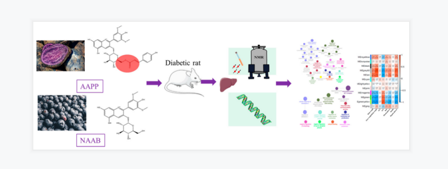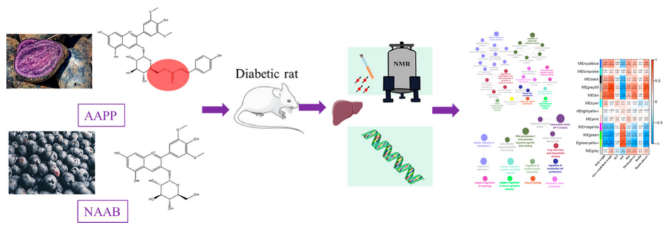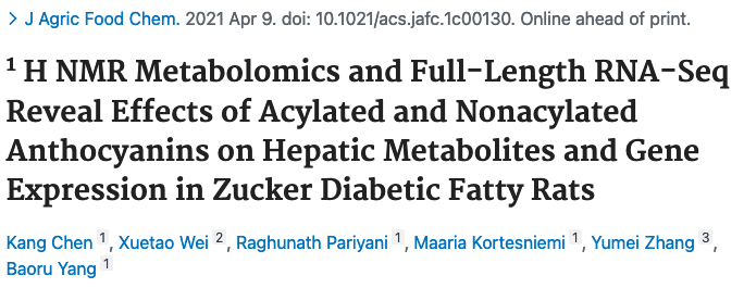 花色苷是植物中的一大類多酚化合物,目前已知是對氧化應激、炎癥和能量穩態有調節作用。已有報道發現花色苷具有抗糖尿病的療效。花色苷的核心結構是花青苷,它可以糖基化形成非酰化的花青苷,糖苷可以酰化后形成酰化的花青苷。且最近有研究表明,與未酰化的花青苷相比,酰化花青苷具有更好的穩定性和抗氧化活性。本研究利用全長轉錄組學和核磁共振代謝組學方法,比較了非酰化和酰化花色苷對糖尿病大鼠肝臟基因表達和代謝的影響。這是第一次綜合應用這兩種強大的技術來研究肝臟基因表達和代謝產物的變化。