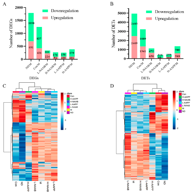 對全長轉錄組數據進行分析發現,在6個不同組之間的差異分析結果中,健康對照組和糖尿病模型之間有691個上調和1098個下調的DEGs,2469個上調和2483個下調的DETs (圖1A和B)。與M組相比,H-AAPP處理改變了最多的基因和轉錄本(101個上調和179個下調的DEGs,89個上調和780個下調的DETs)。DEGs和DETs的熱圖顯示,ND組和CON組在基因表達模式上與M組有很大不同,而且H-AAPP組的轉錄組圖譜似乎比M組更接近ND組和CON組(圖1C和D)。