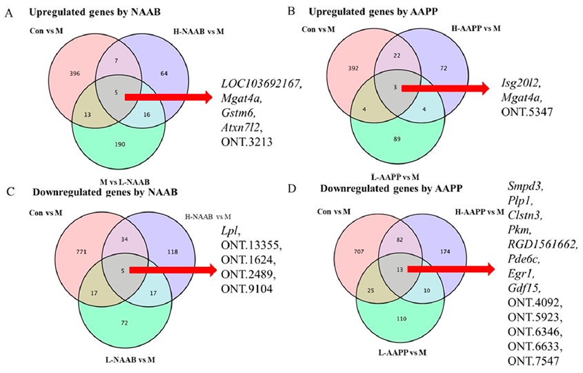 韋恩圖表明了不同分組之間上調和下調的DEG的交集,揭示了受NAAB和AAPP影響的特定基因(圖2A?D)。Gstm6與谷胱甘肽代謝、藥物代謝以及細胞色素P450對外源物質的代謝有關,在胰島素抵抗和糖尿病小鼠中均被報道下調,并可能參與T2D的進展。L-NAAB和H-NAAB均能恢復Gstm6的表達。與ND組和Con組相比,M組中有一個共同的基因被兩種花色苷提取物(NAAB和AAPP)上調,即編碼N-乙酰氨基葡萄糖轉移酶GnT-4a的Mgat4a。在小鼠中,Mgat4a基因的遺傳失活導致葡萄糖轉運蛋白2N-聚糖的錯誤組裝,導致葡萄糖轉運蛋白2和質膜凝集素Galectin 9之間的相互作用失敗,導致葡萄糖轉運蛋白2內化,從而抑制葡萄糖攝取和葡萄糖刺激的胰島素分泌。還發現高脂飲食抑制了Mgat4a的表達。藍莓的非酰化花色苷和紫色馬鈴薯的酰化花青苷都是如此。編碼脂蛋白脂肪酶的LPL在小鼠肝臟中過表達,導致肝臟甘油三酯含量增加2倍,并導致胰島素抵抗,部分原因是對胰島素的反應受損,抑制內源性葡萄糖的產生。在本研究中,L-NAAB和H-NAAB都下調了ZDF大鼠高水平的LPL,這可能導致胰島素敏感性的改善。早期生長反應基因-1(Egr1)可被胰高血糖素短暫激活,介導胰高血糖素調節的糖異生。AAPP降低Egr1,這可能與糖異生減少有關。