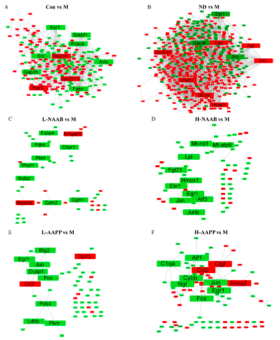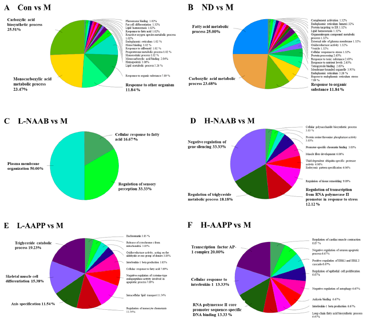 對不同分組中的DEGs進行ClueGO分析,以生成按功能分組的注釋網絡圖(圖4A?F)。在CON/M差異分組的結果中,DEGs主要富集在羧酸生物合成過程、單羧酸代謝過程和對其他有機物的反應過程。在ND/M分組差異結果中,脂肪酸代謝過程、羧酸代謝過程和對有機物的反應過程是富集排名前3的功能分組。在ND/M和CON/M分組中,DEGs主要在單羧酸代謝過程、羧酸生物合成過程、脂肪酸代謝過程、脂肪代謝過程和對有機物的反應過程相關的通路中富集。在L-NAAB/M分組差異結果中,DEGs組要與三個功能通過有關:質膜組織、感覺調節和細胞對脂肪酸的反應。在H-NAAB/M差異結果中,DEGs主要富集于基因沉默的負調控、甘油三酯代謝過程的調控以及RNA聚合酶II啟動子對脅迫反應的轉錄調控。在L-AAPP/M比較中,DEGs在甘油三酯分解代謝過程、骨骼肌細胞分化和軸規范方面都明顯富集。在H-AAPP/M差異結果中,發現轉錄因子AP-1復合體、細胞對白細胞介素-1的反應以及RNA聚合酶II核心啟動子序列特異性DNA結合等通路顯著富集。