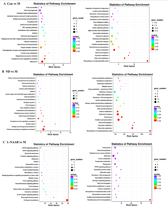 接下來,進行了KEGG通路富集分析。氣泡圖展示富集最顯著的前20條通路(圖5A?F)。與M組相比,Con組上調的DEGs主要富集于以下通路:苯丙氨酸、酪氨酸和色氨酸的生物合成,亞油酸代謝,金黃色葡萄球菌感染,補體和凝血級聯反應,以及甲型流感病毒。ND組與M組相比,上調的DEGs主要富集在花生四烯酸代謝、金黃色葡萄球菌感染、移植物抗宿主病、吞噬小體等通路中,而ND組與M組相比上調的DEGs主要富集在以下通路:苯丙氨酸、酪氨酸和色氨酸的生物合成、亞油酸代謝、金黃色葡萄球菌感染、移植物抗宿主病、吞噬小體。在CON/M和ND/M比較中,下調的DEGs在相似的KEGG通路中富集:不飽和脂肪酸的生物合成、脂肪酸代謝、丙酮酸代謝、脂肪酸伸長、氧化磷酸化和碳代謝。
