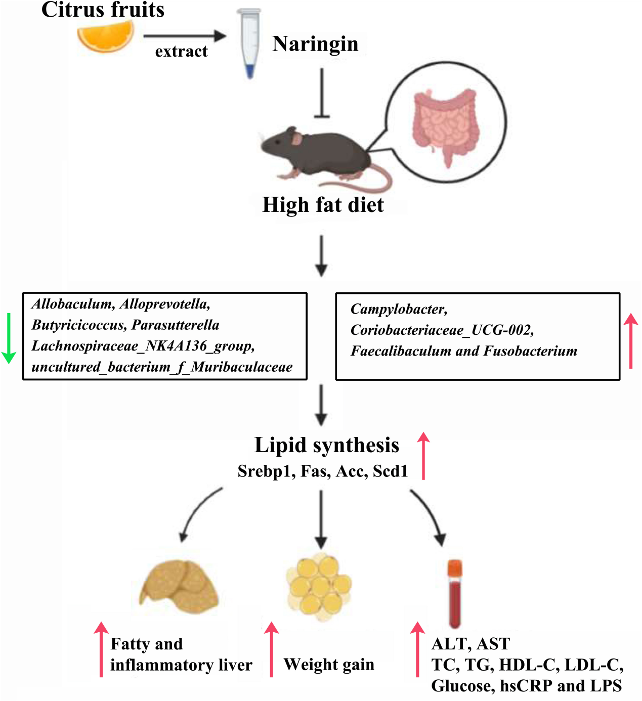 柚皮苷(NAR)是富含在柑橘類水果中的一種主要的黃酮,似乎可以減少肝臟的脂質積累,使其在治療NAFLD方面具有巨大的潛力。使用NAR進行治療NAFLD可能是調節腸道細菌組成的一種潛在策略。然而,尚未有研究報道評價NAR對NAFLD模型小鼠腸道細菌的影響。