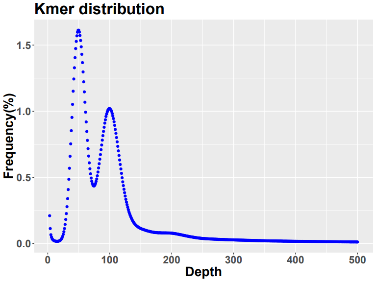 Figure 2一個二倍體的調研圖,橫軸是測序深度(覆蓋度),縱軸是k-mer出現的頻率,主峰位于100左右。