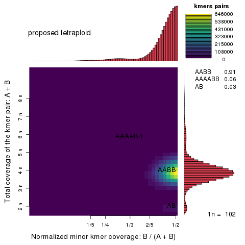 Figure 4一個四倍體的smudgeplot分析結果,橫軸是雜合k-mer對的深度占總深度的比例,縱軸是所有k-mer對的總深度,二者的交點即代表了不同的雜合結構。交點的亮度代表了落入其中的k-mer數。