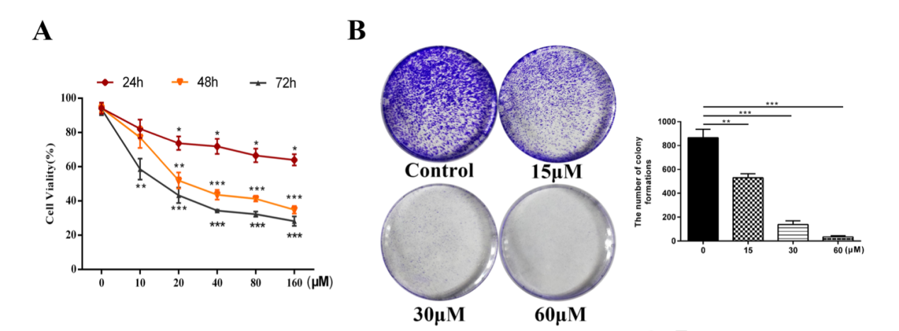 在平板克隆形成試驗中,與未經處理的對照組相比,經不同濃度(15、30和60μM)的α- Cyperone處理的HeLa細胞形成的集落更少且更小,這表明α- Cyperone以劑量依賴性方式降低HeLa細胞的集落形成能力(圖1B)