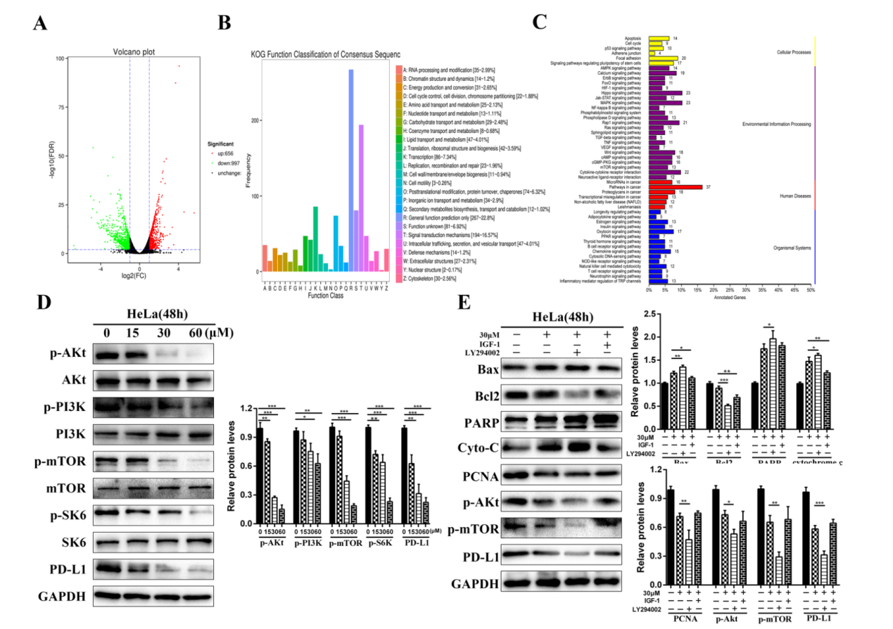 作者對HeLa細胞進行RNA測序分析。根據結果,發現與對照組相比,有656個顯著上調基因和997個下調基因(圖5A)。接下來,通過功能注釋對這些差異基因進行聚類分析。結果表明,α-Cyperone影響了與癌癥相關的多種生物途徑,包括代謝途徑、MAPK信號途徑、PI3K/Akt/mTOR信號途徑、細胞周期和凋亡(圖5B,C)。