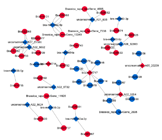 研究人員對油菜細胞質雄性不育系進行了全轉錄組測序,鑒定出一些與花藥發育相關的基因、circRNA和miRNA,利用Cytoscape構建mirna介導的調控網絡和ceRNA網絡,重構了這些RNAs之間的調控關系,并對于關鍵的子網絡相關基因進行了功能注釋分析,挖掘出調控的關鍵功能通路,加深了對花藥發育及雄性不育的理解。