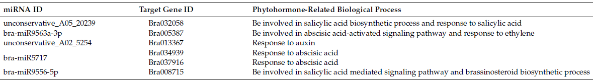 作者使用了TargetFinder來預測miRNA的靶基因,結合差異分析的結果最終得到170對miRNA和基因的調控關系,包含了18個miRNA和37個基因。對這些基因進行GO富集分析,發現主要是細胞過程、代謝過程等功能。對構建的網絡進行研究發現miRNA所調控的基因主要是涉及糖代謝、脂質代謝、花粉管生長等,同時也發現這些miRNA與植物激素相關,比如bra-miR9556-5p可能通過靶向Bra008715來參與水楊酸介導的信號通路和油菜素類固醇生物合成過程途徑。