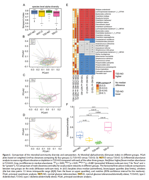 1、四組中不同的腸道微生物組特征在我們的健康人群和新診斷出的?T2D腹部肥胖人群中,擬桿菌、厚壁菌門和變形菌門是所有組中主要的門。這些門占腸道微生物組成的?96%?以上,其他細菌的豐度要低得多(平均低于?4%)。與其他三組相比,T2D-NO組厚壁菌門的相對豐度較高(30%),擬桿菌門的豐度較低(62%)。然而,在四組之間在門水平上沒有觀察到顯著差異(例如,厚壁菌門?p = 0.17,擬桿菌門?p = 0.31,Kruskal-Wallis?檢驗)。在分類分析后?,對四組間的多樣性進行了比較。結果顯示盡管所有四組中的細菌集高度相似,但與其他三組相比,T2D-NO 組的豐度分布異于其他。更具體地說,在?T2D-NO?和?T2D-O?組(p = 0.012,PERMANOVA)(圖?2C)和?T2D-NO?和?NGT-O?組(p = 0.03,PERMANOVA)中差異顯著。NGT-NO?和?T2D-NO?組之間存在分離趨勢,但差異并不顯著(p = 0.108,PERMANOVA)。從?PCoA?中發現?NGT-O?和?T2D-O?組具有高度相似的整體腸道微生物群落特征(圖?2D)(p = 0.918,PERMANOVA)。在物種差異分析中發現,盡管T2D-NO?和?NGT-NO?對照組沒有表現出顯著的群落水平差異,但發現兩個組之間的個體物種差異豐富(圖?2E),例如Akkermansia muciniphila ,Paraprevotella xylaniphila, Ruminococcaceae bacterium和Prevotella copri,,表明?T2D-NO?和?NGT-NO?組的特征在于某些微生物,而不是整個群落的巨大變化。4組的菌群共生網絡分析顯示NGT-O?網絡比?NGT-NO?對照組更小、更簡單,但比T2D-O?組更復雜(圖?2F)。對4組中菌群功能比較發現,T2D-NO?個體的微生物群可能具有較低的碳水化合物利用能力和較高的BCAAs(支鏈氨基酸)?生產能力。此外,與?NGT-NO?微生物組相比,參與碳水化合物代謝(包括“半乳糖降解”)的?KEGG?模塊在?T2D-NO?中高度富集。