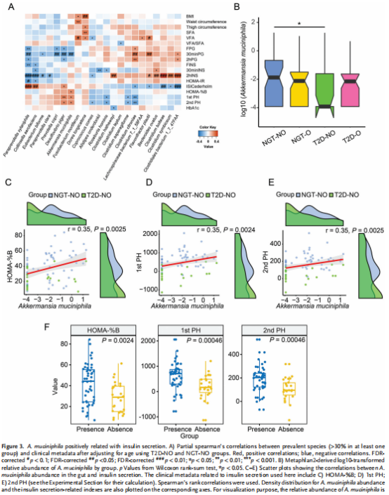 2、A. muciniphila?豐度在T2D-NO中減少并且與胰島素分泌呈正相關