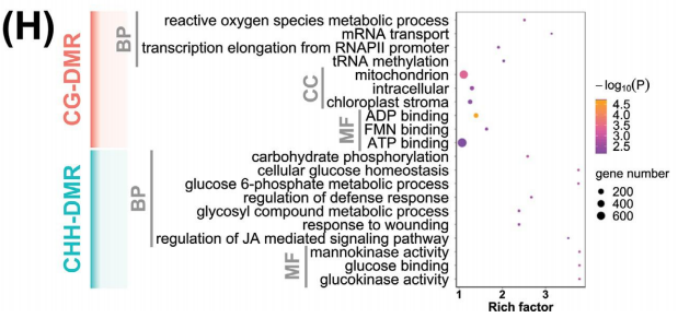 通過WGBS測序技術在10份野生大麥材料中共獲得1620Gb的cleandata,共鑒定出131408470個CG甲基化位點(mCG)(占所有CGs的94.7%)、 97714324個mCHGs位點(占所有CHGs的77.6%)和20576899個mCHHs位點(占所有CHHs的2.9%)。并且一共鑒定出121433個差異甲基化區域(DMRs),其中52306個CG-DMRs,30720個CHG-DMRs和38407個CHH-DMRs(圖C)。通過甲基化區域在染色體上的分布,作者發現CG-DMRs和CHH-DMRs兩種類型的差異甲基化區域在染色體的遠端區域高度積累,并且主要集中在基因區和啟動子區,而CHG-DMRs的情況則和它們不同,不僅在染色體上分布相對均勻,并且基因區和啟動子區的表達也相對比較低(圖A)。這些結果表明,CG-DMRs和CHH-DMRs可能在野生大麥兩個土壤種群的適應性功能多樣化和基因區域調控中發揮重要作用。對CG-DMR基因和CHH-DMR基因進行GO富集分析,發現CG-DMR主要富集在與基本過程相關的基因中,如ATP的產生、轉錄和翻譯,而CHH-DMR基因在代謝過程中富集,包括碳代謝、糖代謝和應激反應途徑(圖H)。
