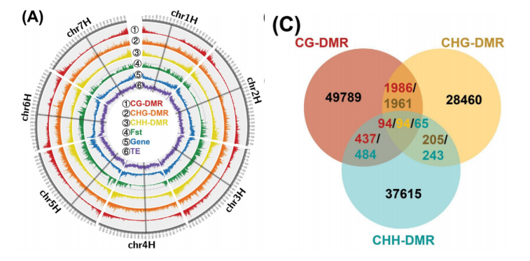 (A) 基因組中甲基化區域、Fst、基因和轉座子元件(TE) 的分布密度?(C)?三種DMR類型的維恩