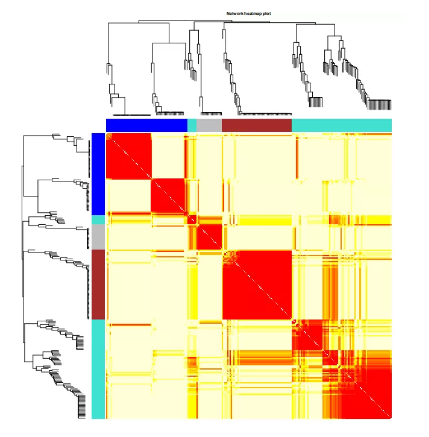 下圖展示模塊與模塊間的相關性。橫軸縱軸分別代表不同的模塊,相關性越弱則呈現藍色,相關性越強則呈現紅色。