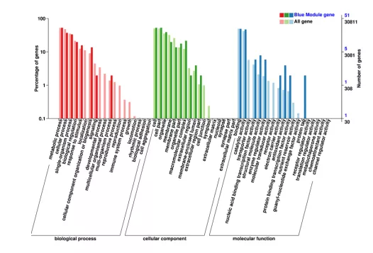 在GO富集分析中橫軸代表GO term,左側縱軸代表基因占比,右側為基因的數目。