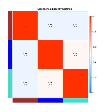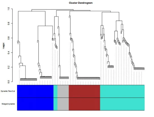 基因網絡模塊主要分為三個部分:第一部分為基因的聚類樹;第二部分為根據基因聚類樹劃分的不同模塊;第三部分為根據第二部分模塊進行了矯正,最后結果為校正后的模塊。