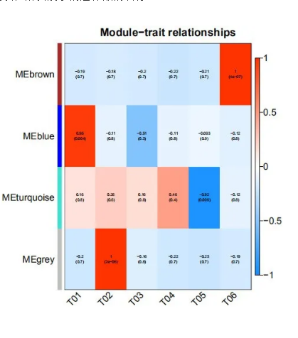基因的系統樹圖及性狀相關性熱圖主要分為三個部分:第一個部分為基因聚類繪制的聚類樹,分枝代表基因;第二部分為基因聚類樹根據不同的聚類對應到的不同模塊;第三部分為性狀的熱圖,如圖中T01~T06為性狀,對應熱圖中的顏色越深,說明該模塊中的基因與該性狀的相關性越高。