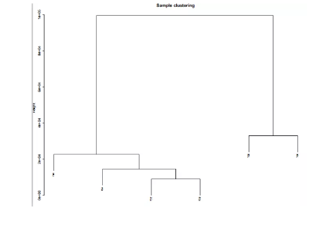 基于基因表達量的樣本系統聚類樹: 在聚類中歐氏距離求兩點的距離,聚類中用類平均法(average)計算集合之間的距離。同一枝上的樣本具有更高的相似性。