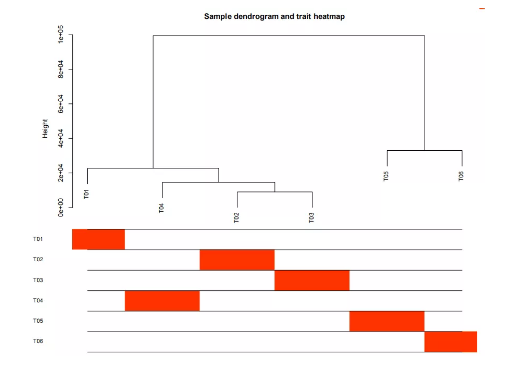 在基因表達量的樣本系統聚類樹的基礎上我們添加了熱圖,樣本與性狀之間的相關性越高熱圖中模塊顏色也會越深。例如我們將熱圖左邊的T01看作是性狀標簽,它與分支樣本TP01的熱圖模塊呈現紅色,說明性狀T01與樣本T01的相關性非常高。