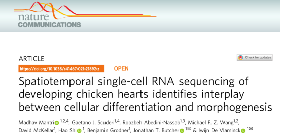 英文題目:Spatiotemporal single-cell RNA sequencing of developing chicken hearts identifies interplay between cellular differentiation and morphogenesis