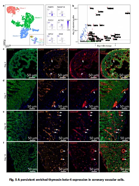 ? ? ? ? 通過對scRNA-seq聚類分析,鑒定出一個富含TMSB4X的異質(zhì)性細胞簇,包含來自所有四個發(fā)育階段的細胞(圖1b)。TMSB4X編碼beta-4,這是一種眾所周知的多效性分泌小肽,在肌動蛋白-細胞骨架組織、細胞運動、存活和分化中起著重要作用。為了深入研究了TMSB4X細胞表型的異質(zhì)性及其轉(zhuǎn)錄譜,作者將1075個TMSB4X細胞重新聚類,并檢查其細胞類型組成(圖5a)。結(jié)果發(fā)現(xiàn)簇1主要由表達TCF21?的心外膜細胞和表達心內(nèi)膜標記物的IRX6和NPC2的心內(nèi)膜細胞組成(圖5a,右)。簇2主要由差異表達的ACTA2的血管壁細胞組成(圖5a,右)。簇3主要由差異性表達FABP5和?TM4SF18的冠狀血管內(nèi)皮細胞組成(圖5a,右)。stRNA-seq數(shù)據(jù)表明,在后期階段,TMSB4X在瓣膜和心室壁中富集。對scRNA-seq數(shù)據(jù)的進一步分析發(fā)現(xiàn),在發(fā)育階段,beta-4表達略有增加,在冠狀血管內(nèi)皮細胞亞簇2中beta-4表達最高。差異基因表達分析發(fā)現(xiàn),與細胞骨架組織相關的基因?VIM、RHOA、ACTB、?ACTG1和DSTN?顯著上調(diào)(圖5b)。此外,研究還發(fā)現(xiàn)了被beta-4激活的鈣結(jié)合蛋白CALM1和?CALM2的上調(diào),兩種蛋白與細胞周期進展、增殖和信號轉(zhuǎn)導有關。總的來說,TMSB4X可以增強細胞骨架組織活性和鈣信號。