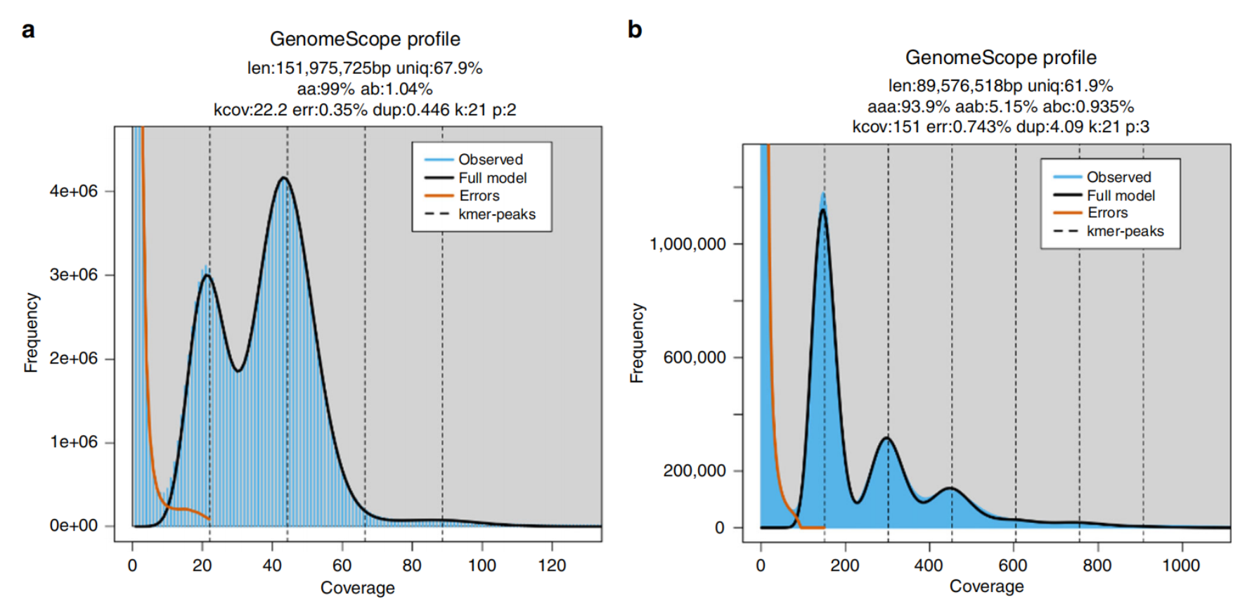 ? ? ? ?但僅知道物種大小是遠遠不夠的,現在為了完成更高質量基因組組裝通常需要選擇不同類型的材料。例如為了構建0?Gap的高連續性基因組,會選擇超高純合度的材料(通過自交純合或是花藥培養等)來降低組裝中的障礙。亦或是為了完成二倍體基因組雙單倍體的組裝,選擇超高雜合度的材料(例如遠緣雜交或是野生材料篩選等)來增加基因組中同源對的差異,從而進行區分與組裝。