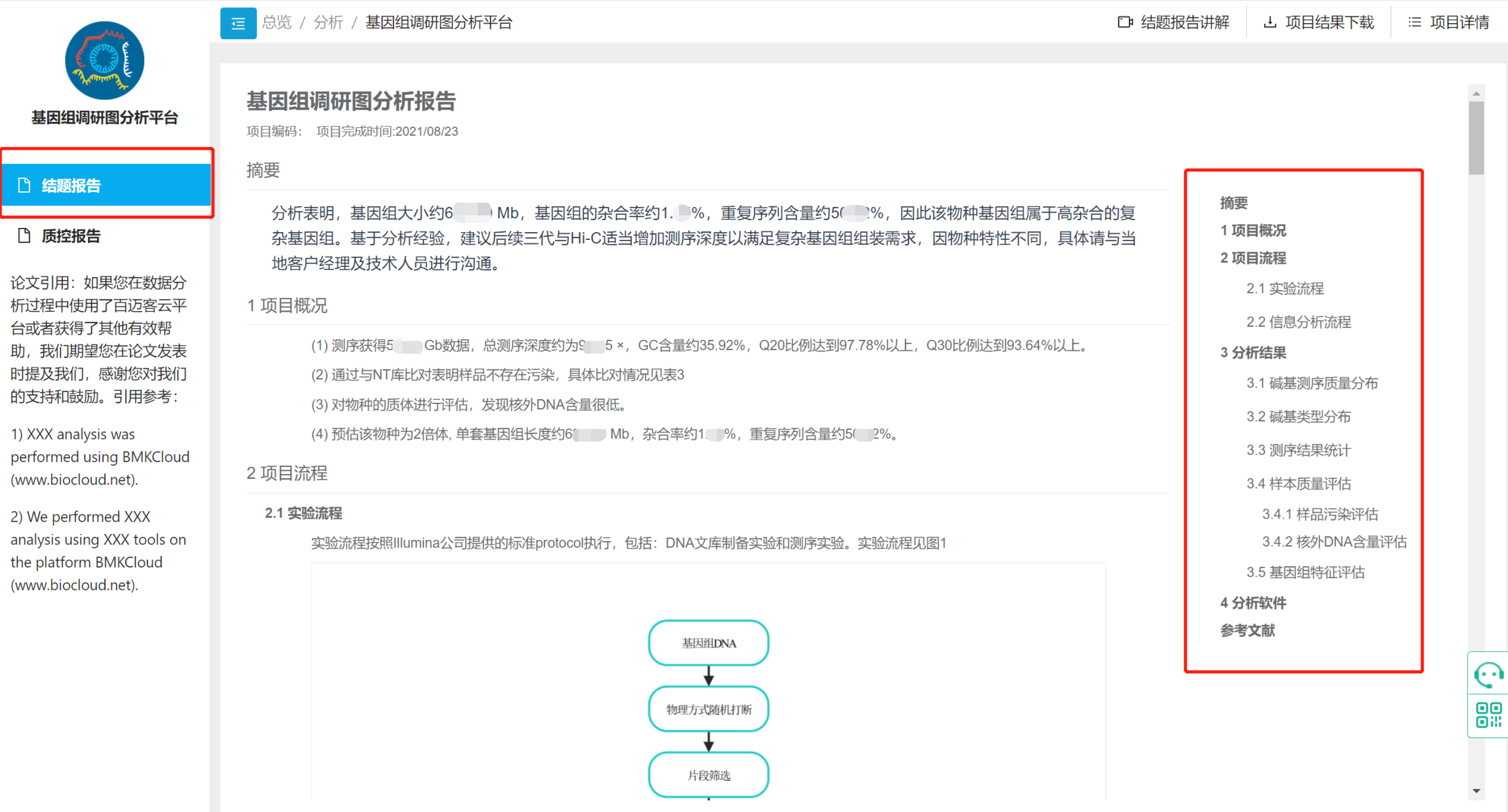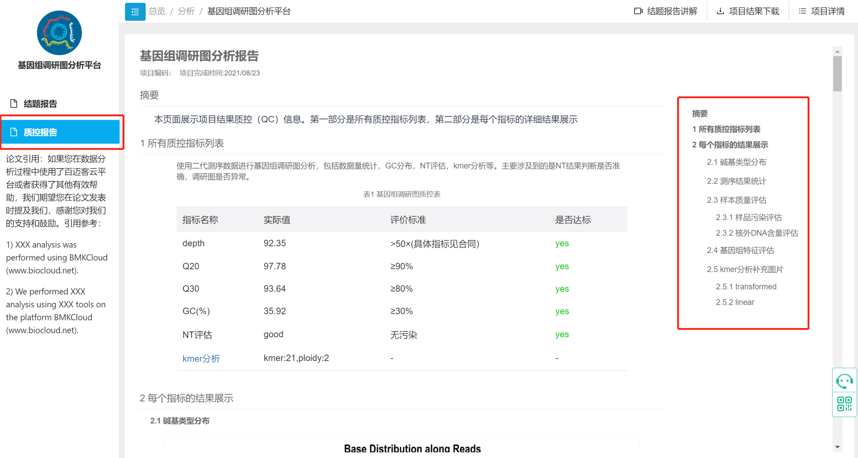 分析完成即可在線查看項目結題報告與數據質控報告。報告將對整體數據質量、污染評估、基因組特征、使用軟件版本等進行詳細描述。具體可見下圖右部目錄。