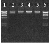 圖2:將提取的DNA每孔上樣300 ng,瓊脂糖濃度為1%,70 V電壓,跑膠45 min。Lane 1:λ-Hind Ⅲ DNA Marker;Lane 2:小鼠心臟;Lane 3:小鼠脾臟;Lane 4:小鼠肝臟;Lane 5:小鼠胃;Lane 6:λ-Hind Ⅲ DNA Marker。