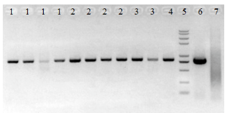 圖3:提取小鼠微量(~5 mg)精子,將提取的DNA進行PCR擴增,擴增產物進行跑膠,瓊脂糖濃度為1%,70 V電壓,跑膠45 min。1:小鼠1精子;2:小鼠2精子;3:小鼠3精子4:小鼠4精子;5:DL2000 Marker;6:陽性對照DNA(825bp);7:陰性對照。