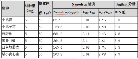用百邁客試劑盒,提取5 mg的不同動物組織中的RNA,然后檢測RNA的濃度以及完整性。結果如下: