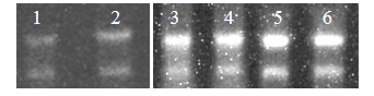 圖4:將提取的RNA每孔上樣200 ng,瓊脂糖濃度為1%,180V電壓,跑膠20 min。Lane 1:小鼠胃;Lane 2:小鼠子宮;Lane 3:石斑魚;Lane 4:東亞飛蝗;Lane 5:白條地藤壺;Lane 6:梨小食心蟲。