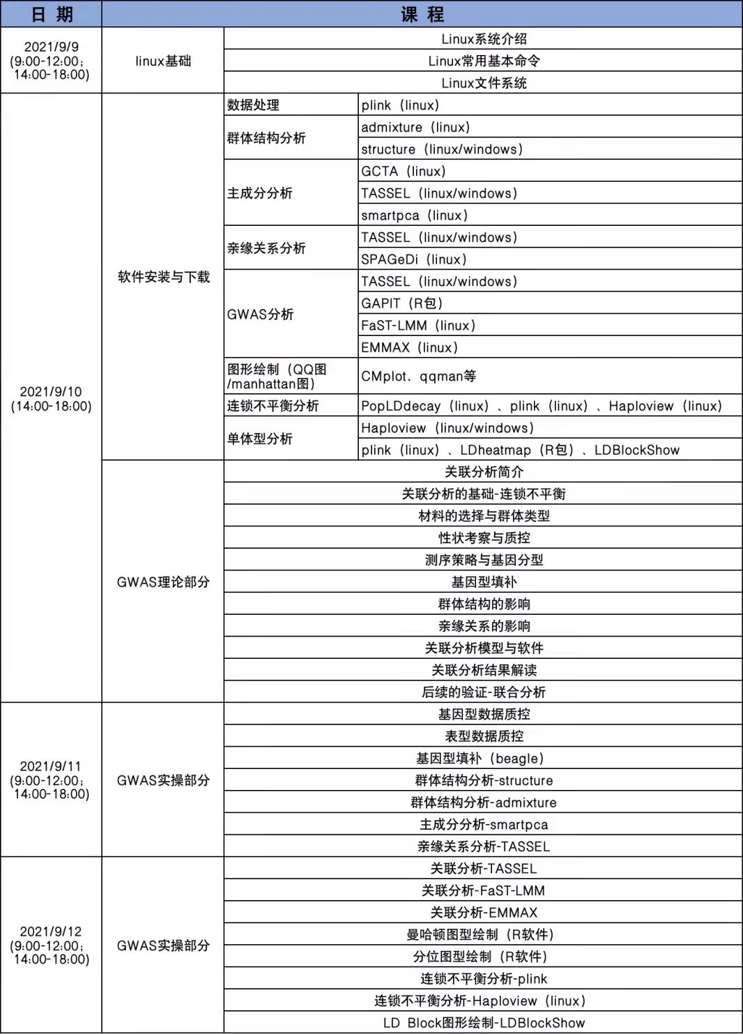 本課程主要從實踐入手,重點講解 GWAS 分析中用到的各種分析方法與常用分析軟件,包括群體結構分析、主成分分析、親緣關系分析、連鎖不平衡分析、單體型分析等內容。從原始數據開始,逐步完成分析內容,并對分析內容進行整理與挖掘,將數據轉化成更直觀的圖形來展示最終的分析結果。同時,課后還可反復觀看上課視頻,有問題隨時售后群中交流溝通,真正實現“線上學習理解,課后練習指導,課下文檔復習”。