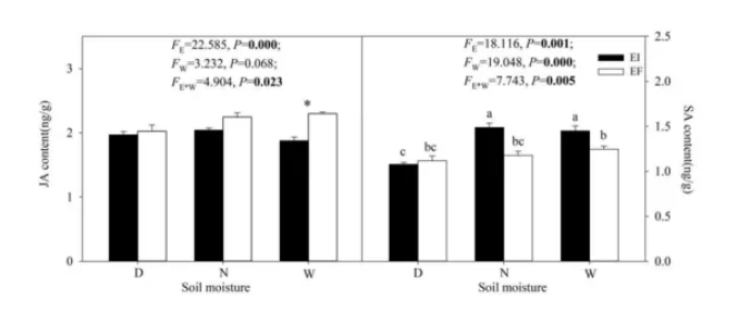 內(nèi)生真菌的存在與否,醉馬草內(nèi)生真菌相互作用對(duì)JA和SA均有含量有顯著影響。在60% 土壤水分含量下,醉馬草JA 含量EF顯著高于 EI。在 EI 或 EF 植物中,土壤水分含量對(duì) JA 含量沒有顯著影響。對(duì)于 EI 植物,三種土壤含水量處理的 JA 水平同樣低。對(duì)于 EF 植物,只有在 15% 的土壤水分含量時(shí),JA 水平與 EI 植物一樣低。在 30% 和 60% 的土壤水分含量下,醉馬草EF的SA含量顯著高于EI。醉馬草EI在30%和60% 土壤水分含量下的 SA 含量顯著高于15%土壤水分含量。
