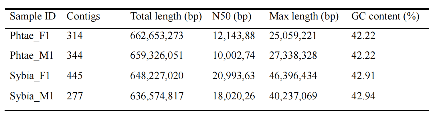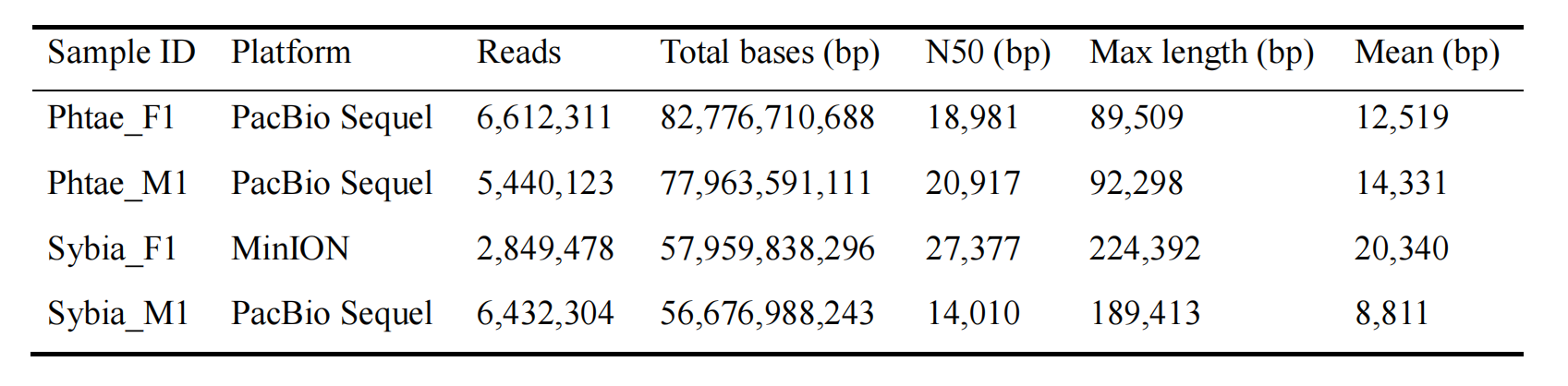 Denovo:雌性、雄性草海龍與雄性綠海龍PacBio平臺;雌性綠海龍Nanopore平臺,雌性、雄性草海龍與雄性綠海龍進行Hi-C測序。三代測序技術對應測序數(shù)據(jù)如下表所示: