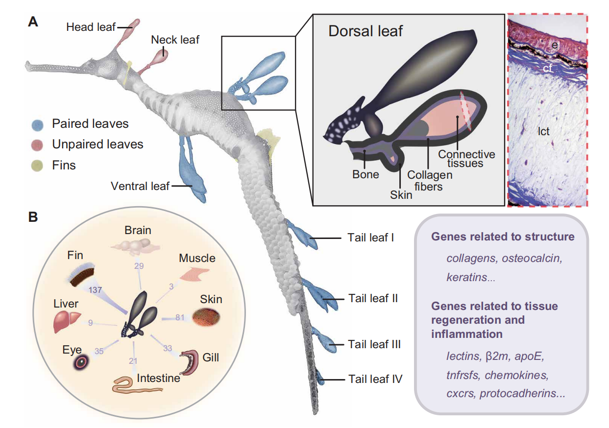 草海龍的頭部、頸部、腹部、背部和尾部區(qū)域有葉子狀的附屬物,可以與周圍環(huán)境相融合,使草海龍以完美擬態(tài)隱匿于海草床中。這些結構是該物種的一種適應性進化產(chǎn)物,主要由骨基質和富含膠原纖維的結締組織組成。通過轉錄組學分析,發(fā)現(xiàn)其表達基因(如msx, dlx, fgf)主要從皮膚和鰭等器官募集而來,暗示了相關基因對新器官產(chǎn)生和維持的重要作用。而“附葉”與鰭相比缺乏肢體發(fā)育特異性的hox基因。草海龍的附葉在捕食者的襲擊中經(jīng)常受到損傷,為了研究相關機制,作者通過轉錄組分析研究發(fā)現(xiàn)在其附葉中炎癥和損傷修復相關基因表現(xiàn)出高表達水平,說明這些基因可能與其附葉的快速愈合和再生能力相關。同時草海龍?zhí)禺愋詳U張的MHC I基因也在附葉中顯著高表達,能為其提供額外的免疫保護。