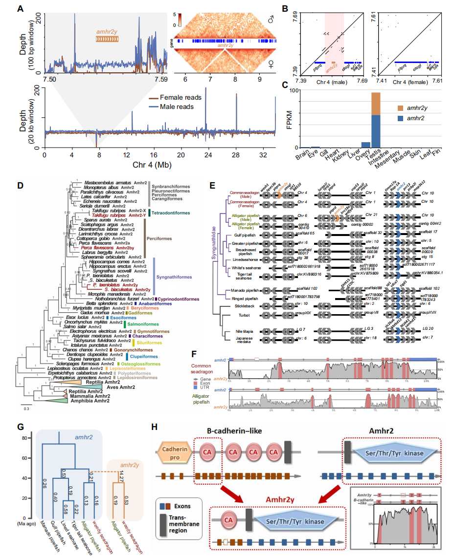 通過雄性和雌性葉海龍Illumina reads正反比對雄性和雌性的全基因組序列,來確定葉海龍中假定的性染色體和性別基因座。結果顯示Chr4上的一個~47-kb區(qū)域僅在雄性中存在, 且reads覆蓋度為Chr4平均值的一半,該片段經(jīng)Hi-C互作分析結果支持。注釋及比較分析發(fā)現(xiàn)草海龍和綠海龍的性別決定基因均為amhr2的雄性特異性拷貝amhr2y,但兩者的基因座不相同。系統(tǒng)發(fā)育分析表明,amhr2y起源于它們最近共同祖先的重復事件,而黃鱸amhr2y是從其譜系中的獨立重復事件進化而來。研究發(fā)現(xiàn)amhr2y比amhr2受到的選擇壓力更強,其整體結構與amhr2相似。