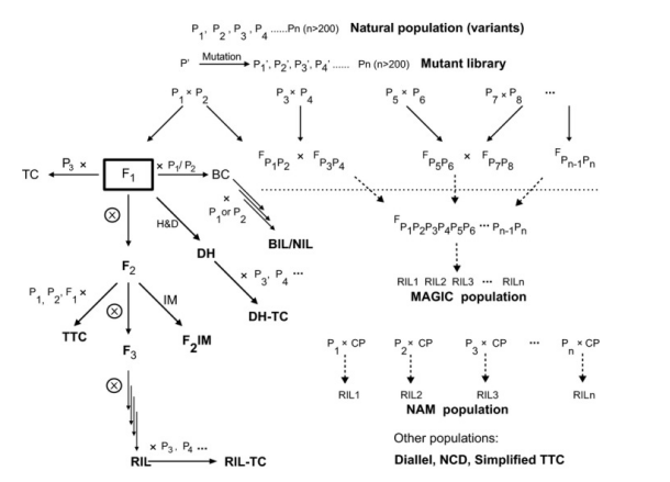 對于動植物群體,通常利用性狀具有顯著差異的兩個親本進行雜交,再通過自交、回交或者其他方式來構建家系群體。家系群體按照遺傳穩定性劃分可分為暫時性分離群體和永久性分離群體;如F1、F2、F3、BC等,這類群體中分離單位是個體,一經自交或近交,其遺傳組成就會發生變化,無法永久使用,所以屬于暫時性分離群體;如RIL、DH等,這類群體中分離單位是株系(或者叫株行),不同株系間存在基因型的差異,而株系內個體間的基因型是相同且純合的,自交不分離。這類群體通過自交或近交繁殖后,遺傳組成不會改變,可永久使用,所以屬于永久性分離群體。