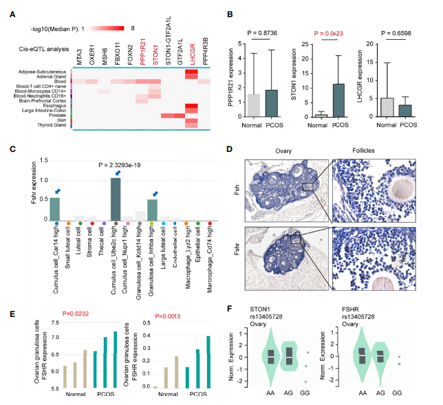 對卵巢組織的單細胞測序數據進行映射,發現 FSHR 在 Cumulus cell_Ube2c 簇(P = 2.3293e-19)、Granulosa cell_Inhba 簇和 Cumulus cell_Car14 簇中高度表達(圖 2C)。這種表達模式在小鼠卵巢組織中得到驗證(圖 2D)。在患者的卵巢顆粒細胞中,發現 PCOS 患者的 FSHR 表達高于正常患者,GSE114419(P = 0.0232)和 GSE138518(P = 0.0013)數據集(圖 2E)。此外,我們對卵巢組織中的 STON1、FSHR 和 rs13405728 SNP 進行了單組織 eQTL 分析(圖 2F)。