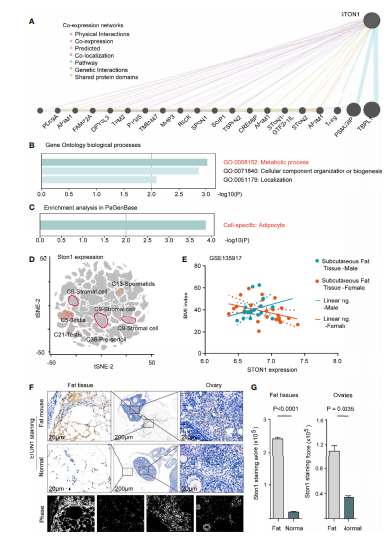 圖E 來自 GSE135917 數據集的男性和女性 STON1 表達與 BMI 之間的相關性分析。來自脂肪飲食小鼠的脂肪組織和卵巢組織中 STON1 的 IHC 染色 (F) 和染色評分 (G)。GO,基因本體論;tSNE,t-distributed 隨機鄰居嵌入;BMI,體重指數;IHC,免疫組織化學。