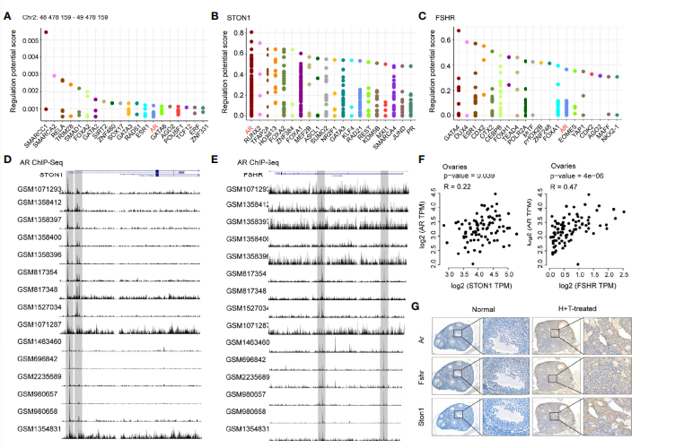 rs13405728 基因座區域的前 20 個轉錄因子 (Chr2: 48478159-49478159) (圖A) STON1 (圖B) 和 FSHR (圖C),調節潛力 (RP) 代表評估 TF 調節基因的可能性的分數 . Y 軸是 RP 分數,X 軸是不同的因素。X 軸上的點代表相同的因素。來自人體組織雄激素受體程序設計的 STON1 (圖D) 和 FSHR (圖E) 中 AR 的 ChIP-Seq 峰(GSE56288 和 GSE70079)。GTEx數據集中卵巢組織中AR和STON1、AR和FSHR(圖F)表達的相關性分析。(圖G) 正常小鼠和高脂肪飲食和睪酮處理小鼠中 Ar、Fshr 和 STON1 的 IHC 染色。AR,雄激素受體;GTEx,基因型-組織表達;H+T、高脂肪飲食和睪酮治療。