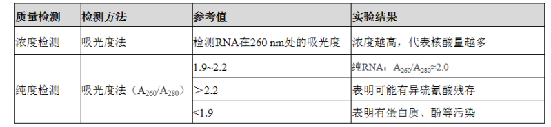 由于RNA具有共軛結構,可以吸收紫外光,故測定RNA溶液在260 nm的吸光度值,可計算出RNA的含量。其中純度高的RNA,A260/A280比值應在1.9~2.2之間,若比值>2.2,表明可能有異硫氰酸,若比值<1.9,表明有蛋白質、酚等污染;建議重新提取RNA。