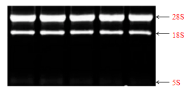 真核生物RNA特有28S、18S、5S三條帶,進行瓊脂糖凝膠電泳分析時,28S條帶的亮度大概是18S條帶的兩倍或者以上,且無拖尾,說明RNA的完整性高、未被其他雜質污染。若出現其他條帶、或者條帶彌散拖尾,建議重新提取RNA。