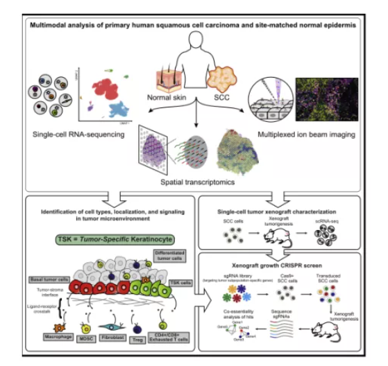 為了確定皮膚鱗狀細胞癌(cSCC)的細胞組成和結構,該研究團隊對10對配對的人體鱗狀細胞癌組織和正常組織單細胞RNA測序、空間轉錄組和多路離子束成像。識別到四個細胞亞群,三個正常細胞亞群以及一個定位于纖維血管邊緣的腫瘤特異性角化細胞(TSK)群。空間轉錄分析揭示了TSK細胞作為細胞間通信的樞紐。最后,人類腫瘤異種移植物的單細胞特性和體內CRISPR篩選確定了特異性腫瘤富集基因亞群和相互作用網絡在腫瘤發生中的重要作用。