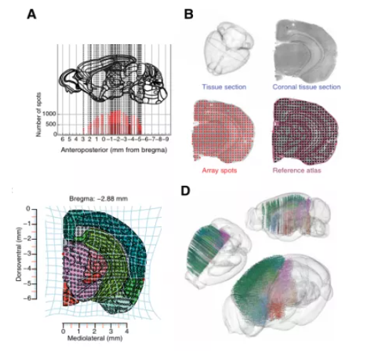 通過使用全腦空間轉錄組學基于對空間定義特征的無偏識別來生成成年小鼠大腦的系統分類。研究發現分子信息足以推斷大腦的復雜而詳細的神經解剖組織結構。無監督分類顯示了特定于區域和層的子區域,在等皮層和海馬體以及紋狀體的新亞區。分子圖譜進一步支持了從單細胞RNA圖譜中表征神經元的空間特性,并提供了使用最小基因集(大腦調色板)為大腦添加注釋的資源。總之,本研究建立了一個分子圖譜來正式定義大腦區域的空間組織,包括用于映射和靶向離散神經解剖結構域的分子代碼,通過空間維度直觀詮釋了大腦組織不同空間區域特征,為剖析大腦組織提供了全面的時空圖譜。