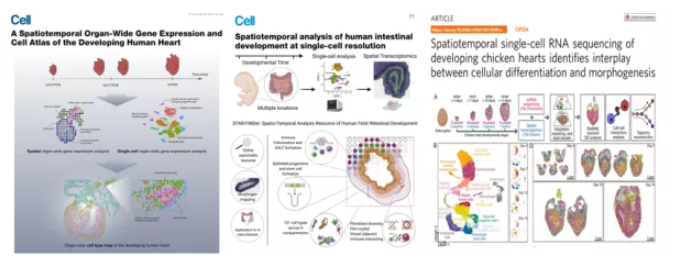 細胞在空間位置的異質性,對于干細胞分化、組織發育和再生起著重要作用,空間轉錄組技術已經在人的胚胎心臟、胚胎腸道和雞的胚胎心臟發育中得到應用,探明了胚胎發育的動態過程,空間組學發展可以清晰的描繪胚胎發育的藍圖。