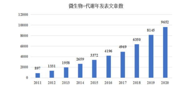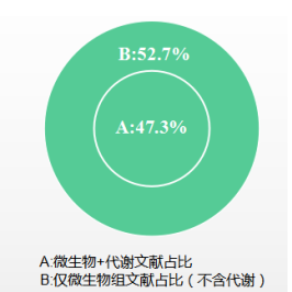 小編先在PubMed網站搜索了一下微生物組和代謝在2011-2020年的發文情況。以微生物組和代謝組為關鍵詞搜索文獻數量信息。從數據中我們可以看到,微生物和代謝相關文章在逐年增加,47.3%的微生物發表文獻中都包含代謝組,微生物組+代謝組研究已逐漸成為微生物研究中的重要多組學研究思路。