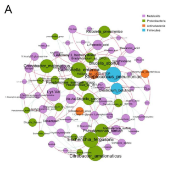 主要結果:慢性阻塞性肺疾病(COPD)是全球第三常見的死亡原因,表現為一種持續炎癥性肺部疾病,沒有根治方法。肺部微生物群促進了COPD的發展,但腸道微生物群的功能仍不清楚。在該研究中,研究者比較了COPD患者和健康對照組的糞便微生物組和代謝組,發現146種細菌在兩組之間存在差異。運用非靶向代謝組學鑒定出COPD的特征包括46%的脂質、20%的異型生物質和20%的氨基酸相關代謝物,通過相關性分析,構建了Streptococcus parasanguinis_B與COPD疾病相關代謝產物之間的相關網絡,COPD患者的糞便微生物組和代謝組與健康人不同,可能有助于尋找COPD的生物標志物。